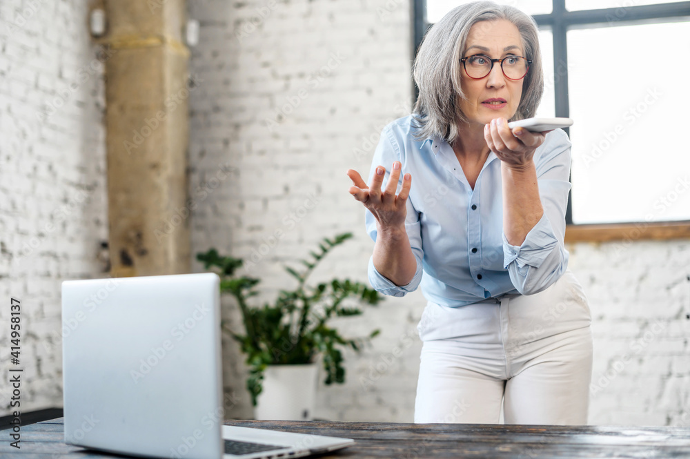 Busy elderly business woman in eyewear using voice recognition app on the phone. Modern aged female office employee holding smartphone near mouth and recording voice message