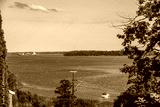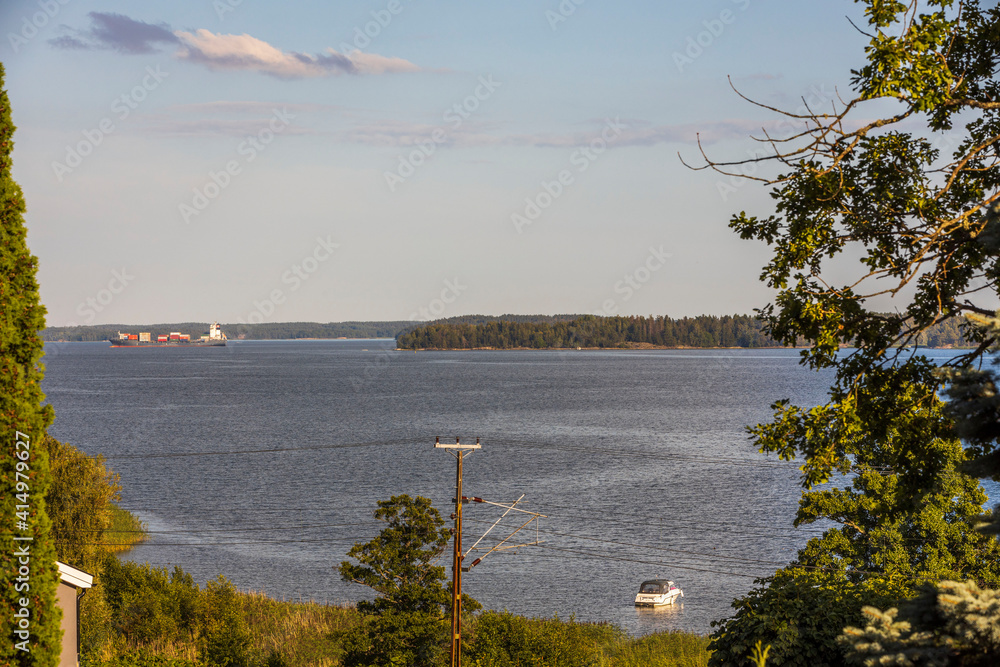 Beautiful view of Baltic Sea with a parked boat on summer day. Beautiful summer nature backgrounds. Sweden, Europe.