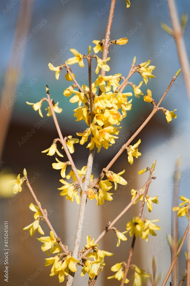 A flowering branch of the Forsythia shrub.