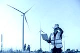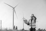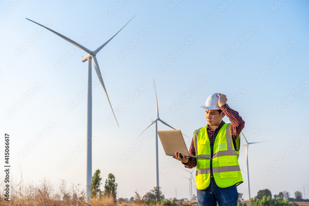 stressed male engineer having problem to working with laptop computer against wind turbine farm