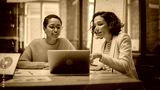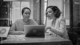 Two Diverse Multiethnic Female Have a Discussion in Meeting Room Behind Glass Walls in an Agency. Creative Director and Project Manager Compare Business Results on Laptop and App Designs in an Office.