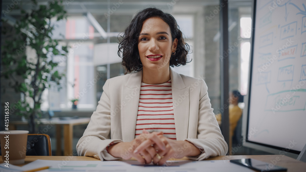 Point of View from Camera Portrait of Beautiful Multiethnic Latina Project Manager Having Video Call in Creative Office Environment. Happy Female Specialist Listening to a Colleague Over Live Camera.