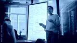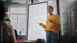 Project Manager Makes a Presentation for a Young Diverse Creative Team in Meeting Room in an Agency. Colleagues Sit Behind Conference Table and Discuss Business Development, User Interface and Design.