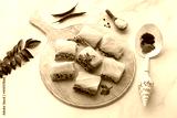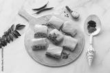 Uncooked boneless pieces of threadfin fish. Raw Dadha fish cubes placed on a blue plate. clean fish fillets with skin on. Recipe ingredients such as rock salt, coriander, and spices. Copy space.