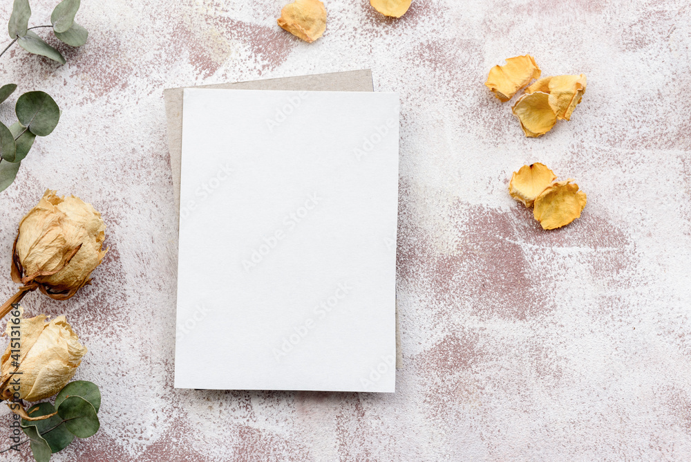 Romantic natural gentle background-a clean postcard and twigs of dry grass and flowers. Top view, close-up, and copy space. Wedding and gift fund.