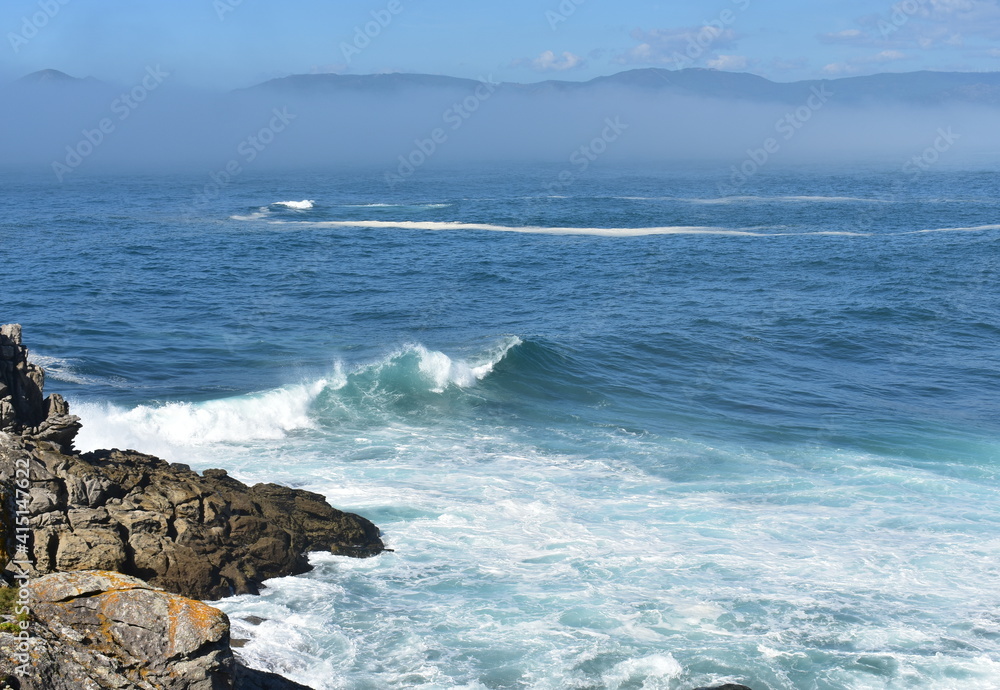 View from a cliff with waves breaking at famous Rias Baixas in Galicia Region. Spain.