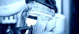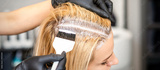 The hairdresser dyeing blonde hair roots with a brush for a young woman in a hair salon