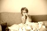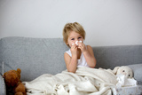 Blond toddler child, wiping his nose in a tissue, sneezing and coughing