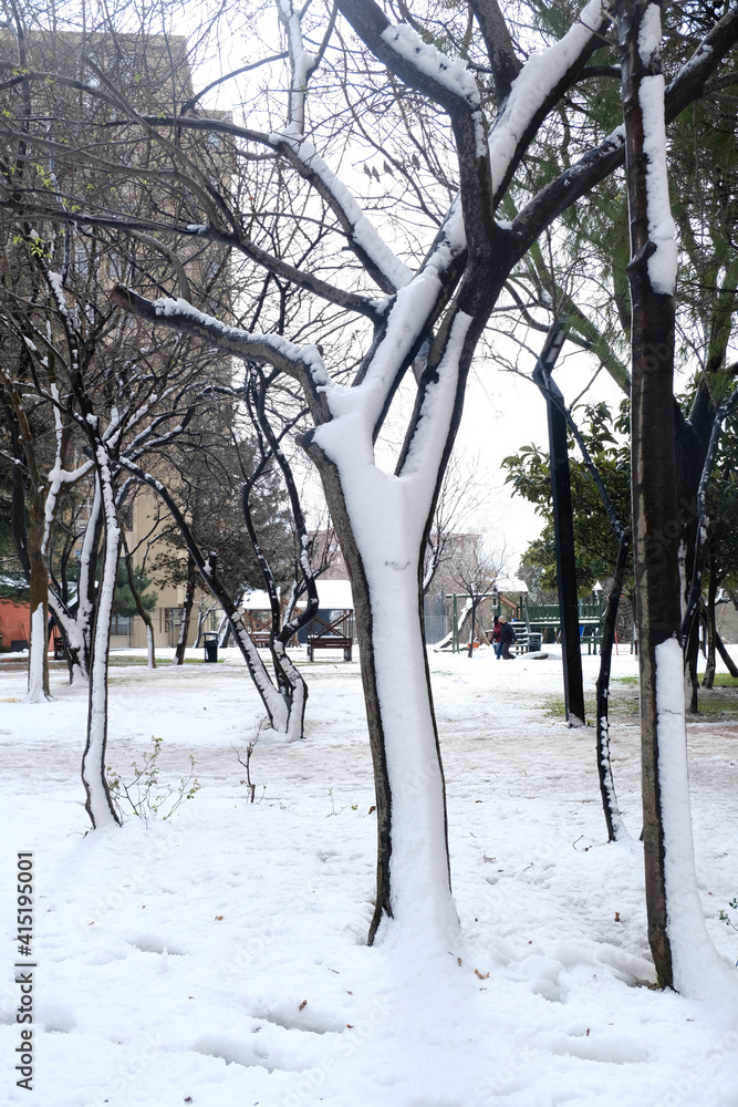 Vertical shot of snow-covered trees in the park on the building's background in Istanbul, Turkey