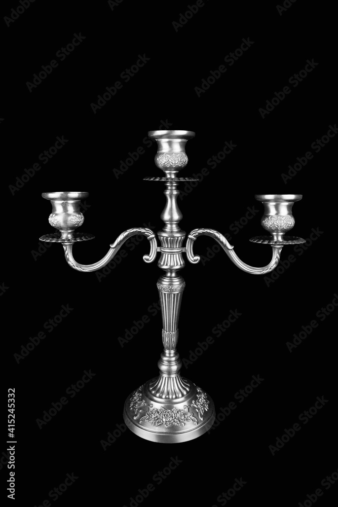 Triple silver vintage candelabrum with three candlesticks on black background
