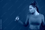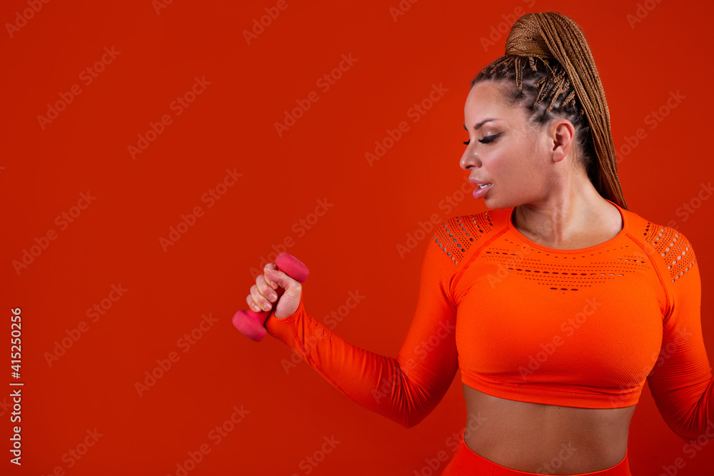 beautiful adult woman in tracksuit on red background with dumbbells