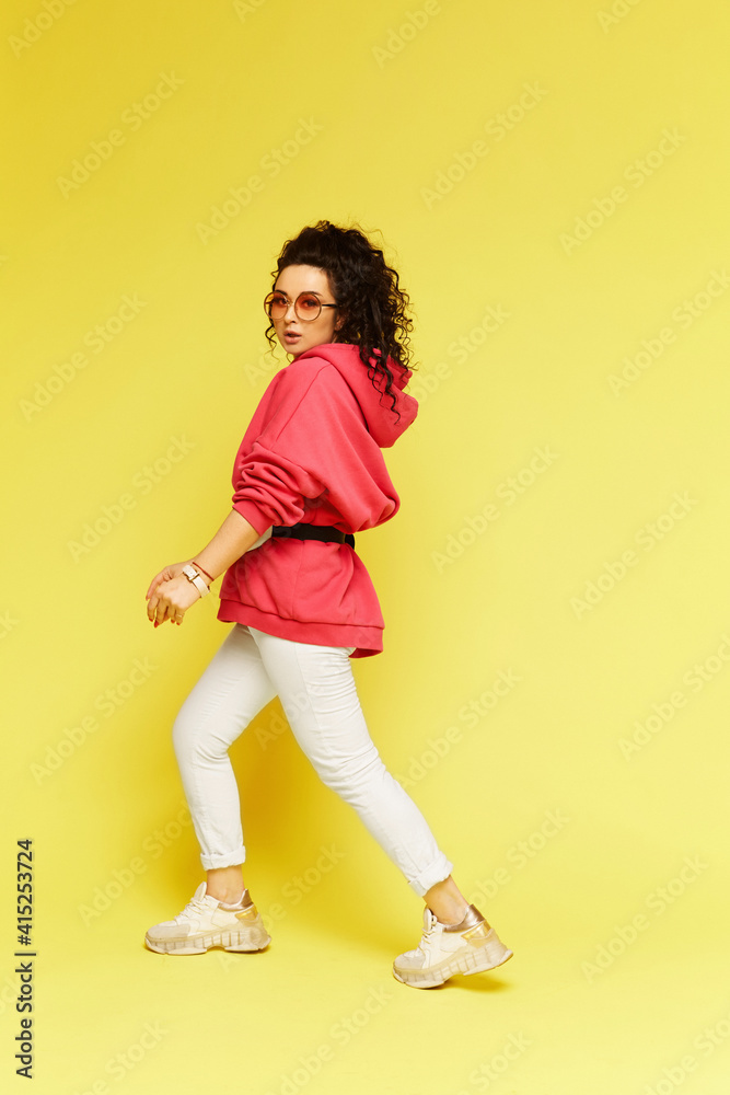A young woman in sportswear and sunglasses over a yellow background. Young beautiful woman in a pink hoodie and white pants at the yellow background, isolated