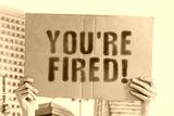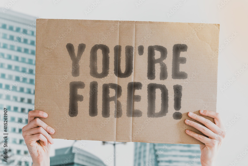 The phrase " You're fired " on a banner in hand with blurred background. Employee. Entrepreneur. Business. Money. Earnings. Boss. Jobless. Recession. Terminate. Employer. Trouble. Career