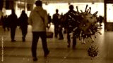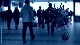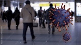 3D illustration virus Covid19 floating in the air. Japanese passengers on metro