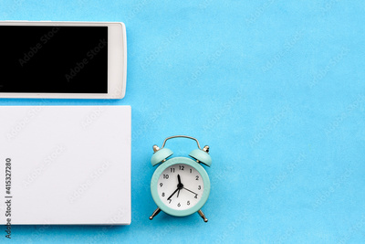 A stationery mock-up of a scene on a blue background - a stack of white cards, an alarm clock, and a smartphone.