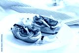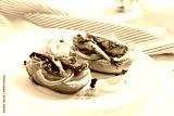 Sandwich - smorrebrod with sprats, avocado, tomatoes, eggs and cream cheese on white plate. Danish cuisine. Eco friendly concept.