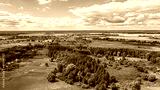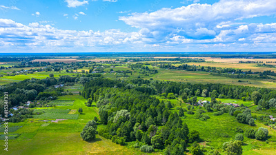 Aerial view over beautiful suburb in wide valley, in the summer. Top view to the small village with a beautiful green landscape.