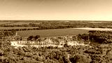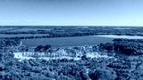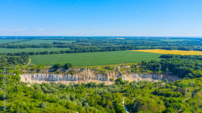 Aerial drone view - Beautiful summer landscape old chalk quarry. Bird view over nature landscape with old chalk quarry. Beautiful hilly.