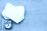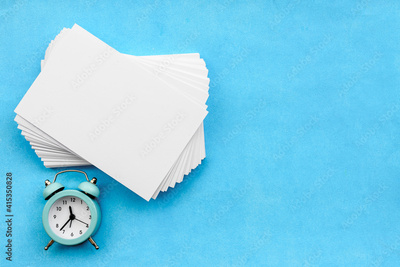 Stationery layout on a blue background - a stack of empty white cards, a blank for the inscription and an alarm clock.