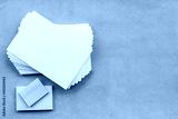 Stationery layout on a blue background-a stack of empty white cards blank for the inscription