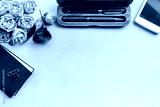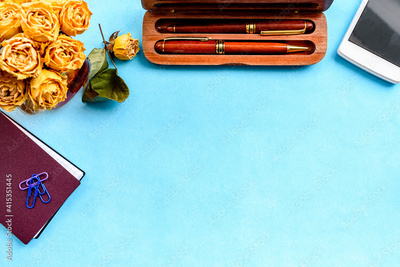 Stationery layout on a blue background. Alarm clock, white postcards, flowers and a smartphone.