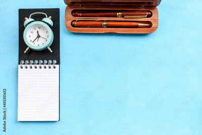 Stationery layout on a blue background - a notebook on a spring, parkers and a vintage alarm clock.