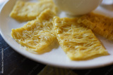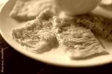 Roti Jala with chicken curry sauce. It is a popular Malay and Minangkabau tea time snack served with curry dishes which can be found in Indonesia, Malaysia and Singapore.