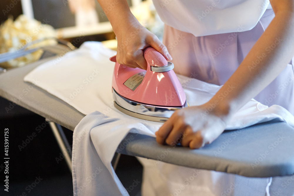 Midsection of a young Asian Chinese woman ironing her clothes with iron board in the bedroom.