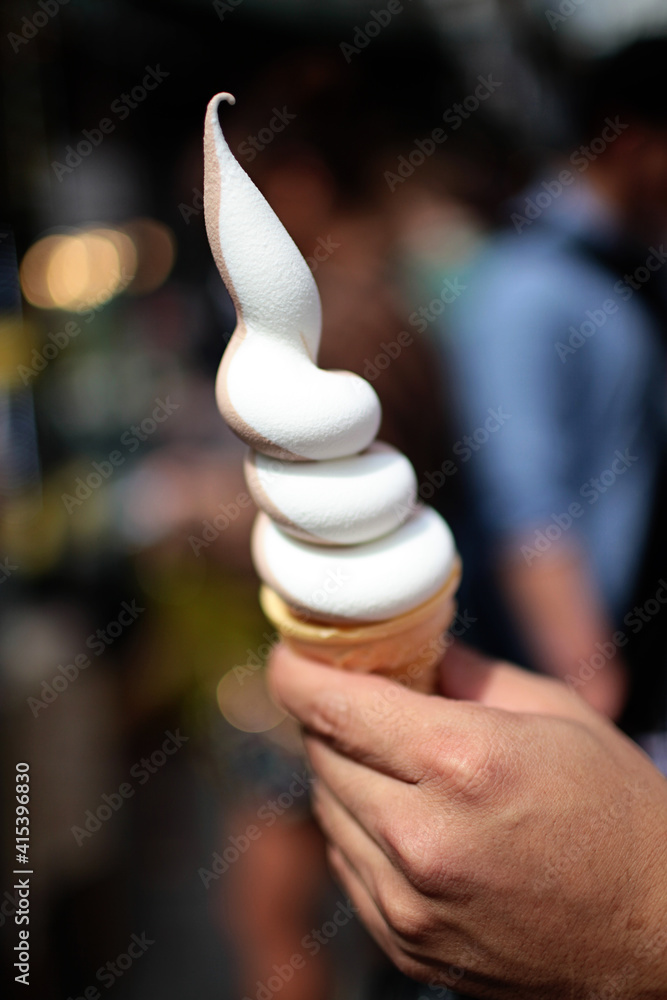 Cropped Image Adult Hand Holding A soft serve Ice Cream on a street.