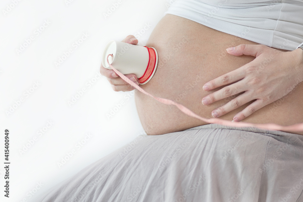 Belly of a pregnant Asian woman with a paper cup phone close-up