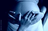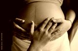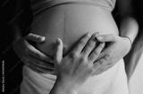 Midsection Of Pregnant Woman With Hands On Stomach. Black And White Image.