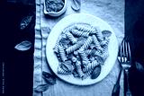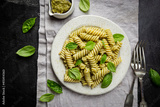 Italian Fussili pasta with basil pesto and fresh basil on black background. Top view.