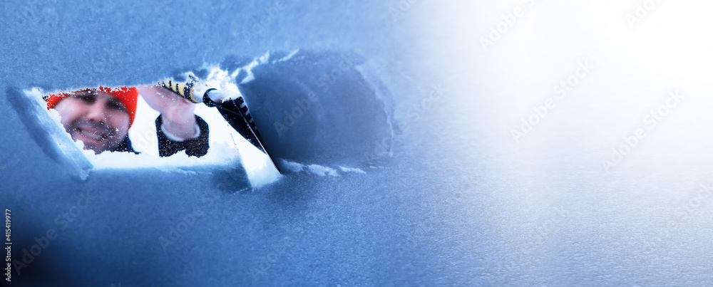 A male driver is standing in front of a car. The owner cleans the car from snow in winter. Car after a snowfall.