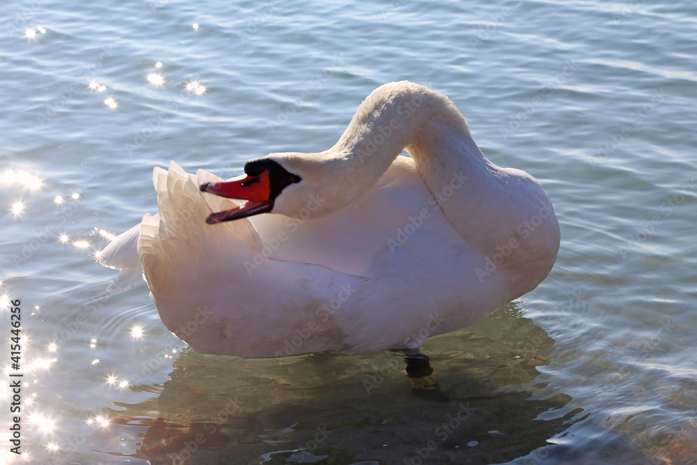 Beautiful young swan swim by the shore