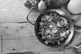 Paella, rice dish from Spain with prawns, chicken and vegetables in a flat pan on a rustic wooden table, copy space, high angel view from above