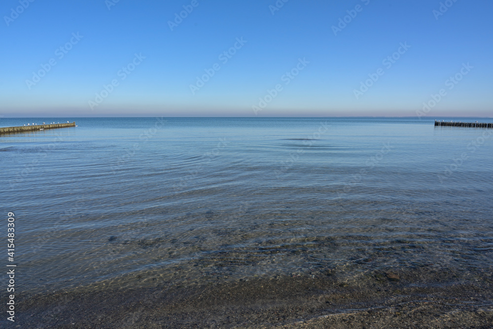 View to the horizon on the beach of the Baltic Sea framed by rows of groynes, nature background concept for environment and tourism, copy space
