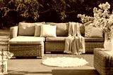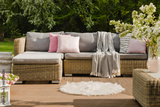 Cozy wooden terrace with grey sofa with pastel pink pillows and blanket