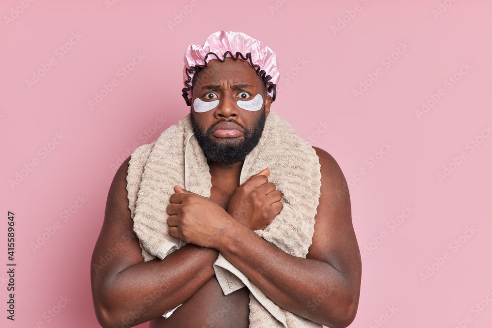 Photo of puzzled black man trembls feels cold going to have shower crosses arms over naked body wears bath hat beauty patches and towel over neck isolated over rosy background. Showering concept