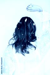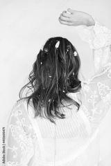 Image of young woman with boho hairstyle, back view. Hair with flowers and chains