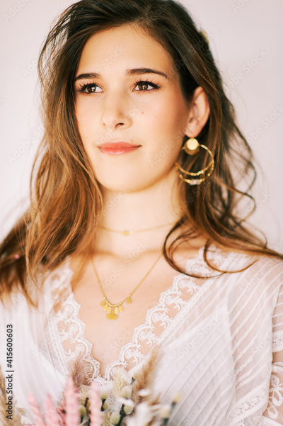 Fashion portrait of pretty young woman wearing boho style dress, holding bouquet of dry flowers, hippie style model posing on white background