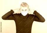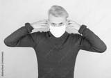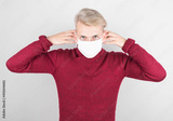 a man in a red sweater wears an anti-virus mask to prevent others from contracting the coronavirus COVID-19 and SARS cov 2