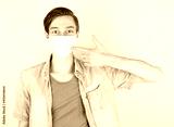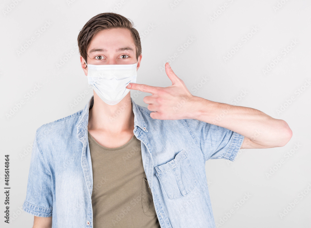 Young man guy in denim t-shirt posing isolated on white wall background studio portrait. People emotions lifestyle concept. Copy space for copy. Pointing index finger at a medical mask