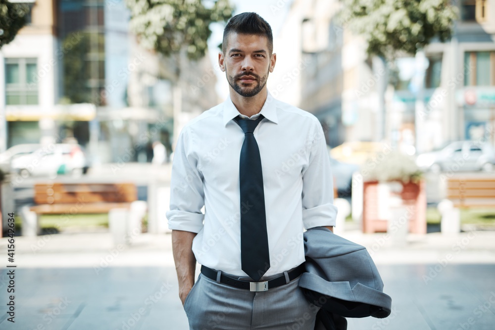 Portrait of good-looking young adult businessman outdoors on street wearing suit and tie.