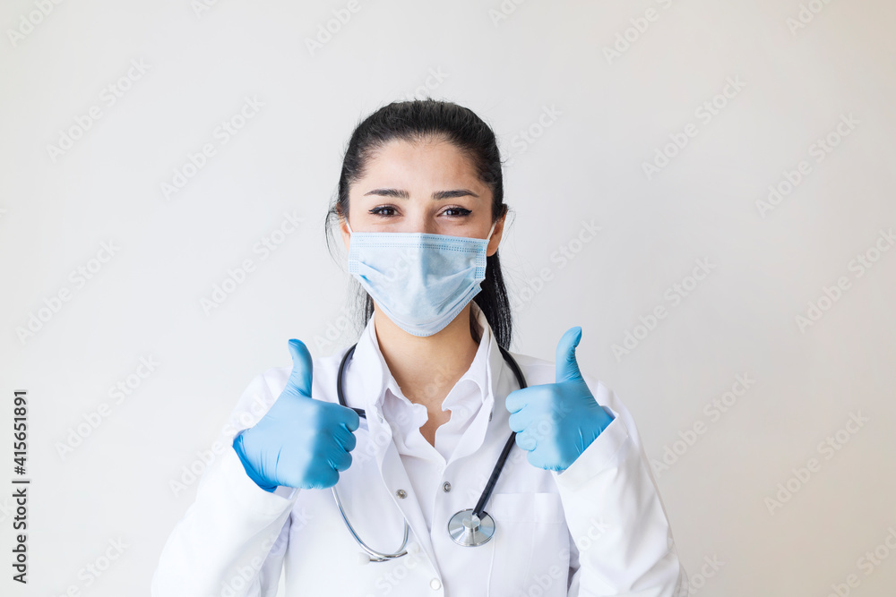 Covid19, coronavirus, healthcare and doctors concept. Portrait of optimistic female doctor assure everything be okay, thumb-up, wear medical mask to prevent catching virus, white coat