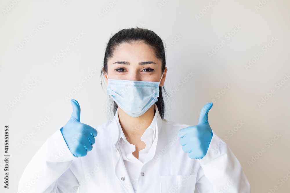 Covid19, coronavirus, healthcare and doctors concept. Portrait of optimistic female doctor assure everything be okay, thumb-up, wear medical mask to prevent catching virus, white coat