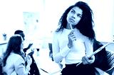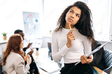 Portrait of pensive African American woman. Thinking young business lady looks thoughtful away, thik about strategy or idea, in the background are her colleagues