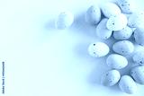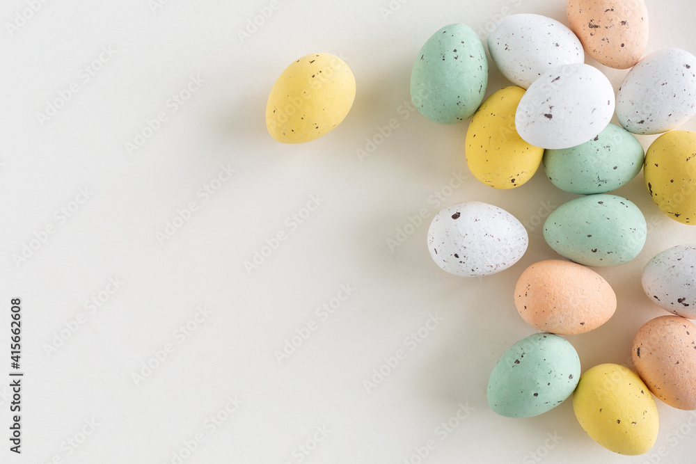 Chocolate easter egg in pastel colors on a white background, flat lay with copy space