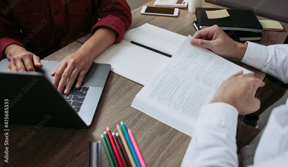 Student friends are using laptop searching for information about reading in class.