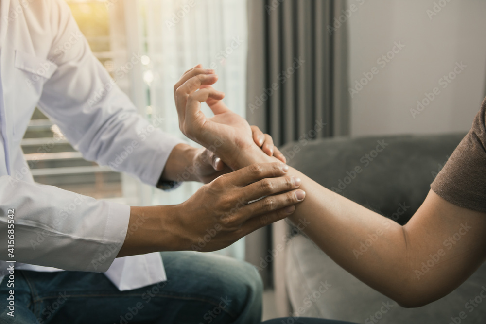 Physical therapist checks the patient wrist by pressing the wrist bone in clinic room.