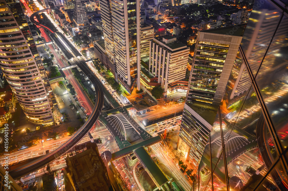 Aerial view of Bangkok city at night in Thailand. cityscape of Modern buildings, urban architecture and road traffic